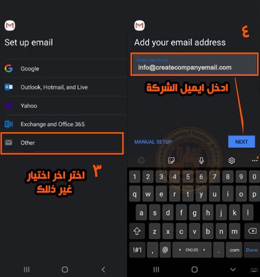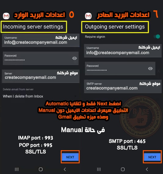 تطبيق Gmail يتميز انه يقوم بضبط اعدادات البريد تلقائيا دون تدخل منك عكس تطبيق Outlook الذى يتطلب ادخال الاعدادات Manual هنا اضغط على Next فقط وسيتم تثبيت البريد , في حالة Manual هيكون user هو البريد و server هو الدومين و Port هو 993 للـ IMAP اما POP هو 995 اما SMTP هو 465 وهذه هي اعدادات شركة بريد في قطر .